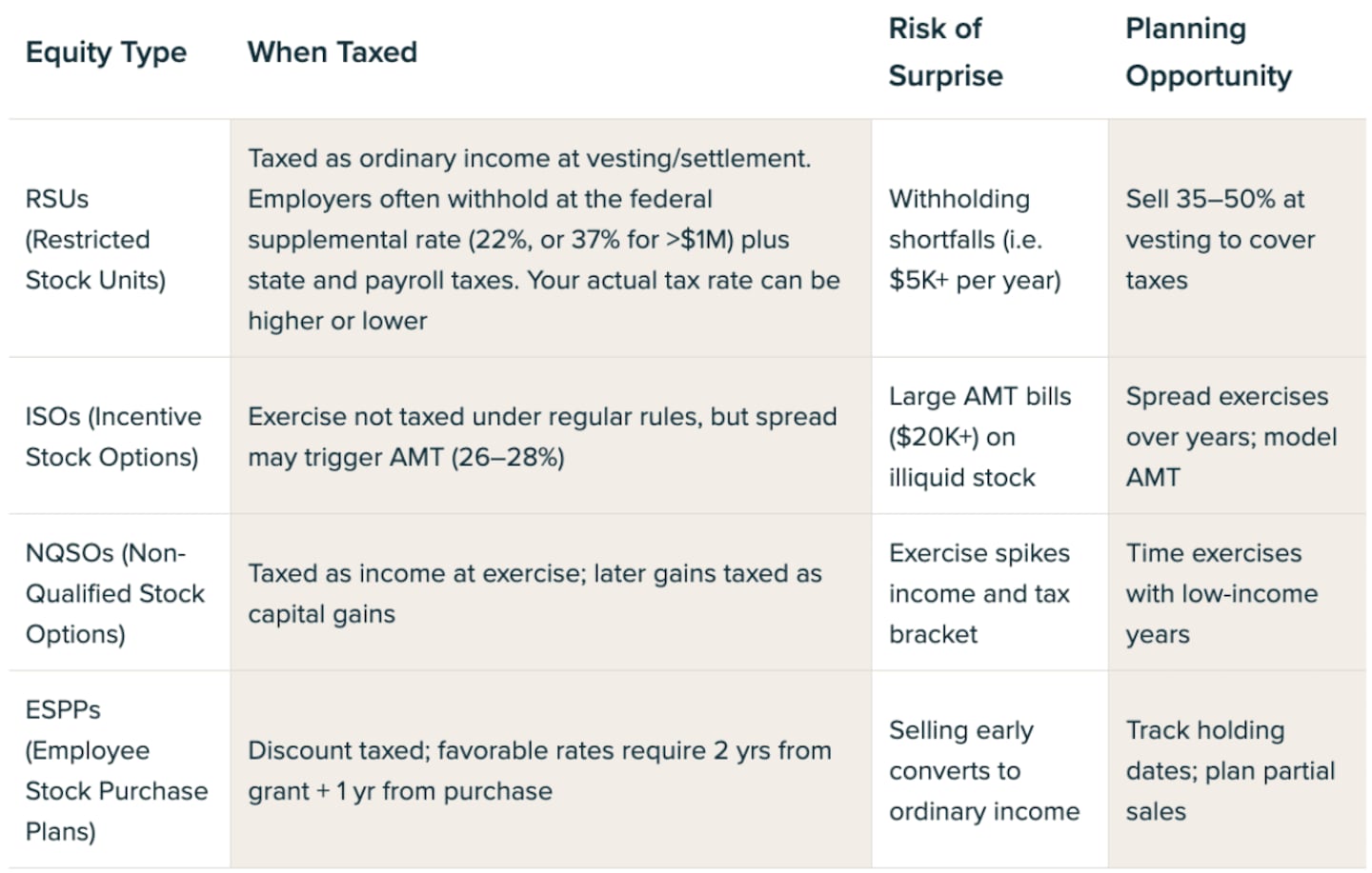 - If exercising ISOs, consider working with someone who understands equity compensation planning, as timing AMT exposure can potentially save you thousands of dollars.