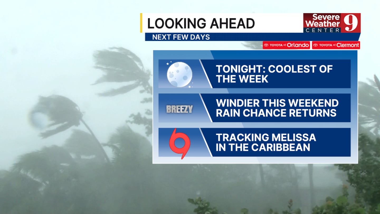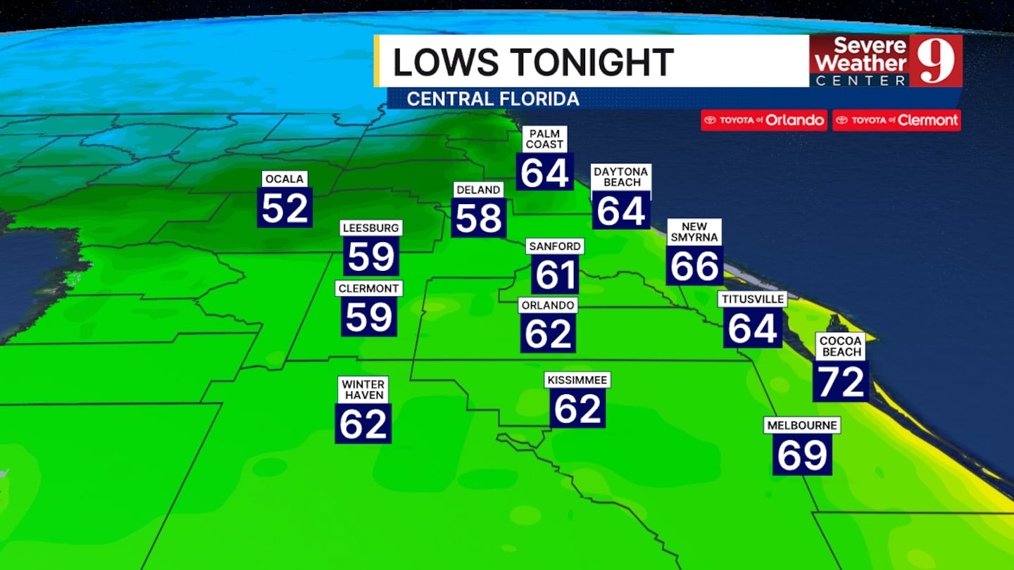Many in the Channel 9 viewing area will dip back into the 50s. Orlando will stay a bit warmer, dropping to a low of 62°.