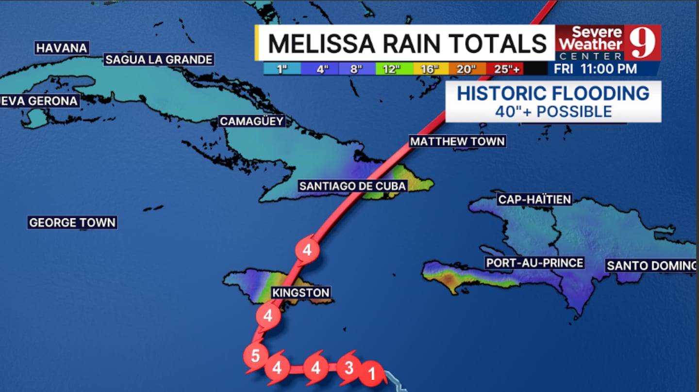 Melissa will be capable of producing 15-30 inches of rainfall in Haiti and Jamaica through Wednesday. Isolated storm totals over 40 inches is possible.